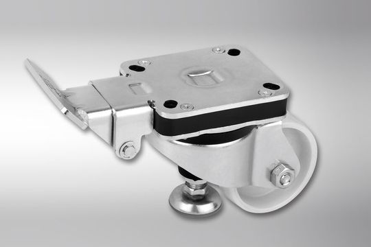 Bei den einfach bedienbaren Heberollen von Norelem schwenkt der Feststellhebel nicht mit der Rolle mit. Ein Tritt genügt: Der kurze Betätigungsweg wandelt die Kraft in einen Stößelhub mit einer Aushubkraft von 15 mm um. Mit einer Tragfähigkeit von 230 kg können die Heberollen selbst schwere Geräte oder Einrichtungselemente einfach anheben und sicher fixieren. Mobile Arbeitsplätze oder Transportfahrzeuge sind so standfest wie ihre radlosen Varianten, sobald der Hubmechanismus abgesenkt wird.