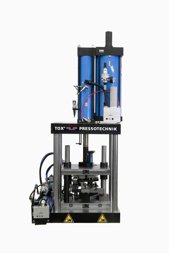 Bei den Grundeinheiten mit den pneumohydraulischen Antriebszylindern, die einen Hub von 200 mm, davon 10 mm Krafthub haben, sind die Werkzeugeinbauräume vergleichsweise groß. Sie sind entsprechend den Bearbeitungsaufgaben entweder mit Stanz- oder mit Clinchwerkzeugen bestückt, die bei Tox Pressotechnik konstruiert und gebaut werden. Dabei kommt beim Clinchen der Kupplungspedalträger in Station 1 ein Tox-Mehrpunktwerkzeug zum Setzen von gleichzeitig drei Tox-Rund-Punkt-Blechverbindungen und ein integriertes Achsbolzen-Crimpwerkzeug zum Einsatz. Bei Station 2, dem Stanzen der Kupplungspedalträger, wird ein 9-Loch-Stanzwerkzeug eingesetzt. Auch an Station 3, dem Clinchen der Bremspedalträger, wird ein Tox-Mehrpunktwerkzeug zum Setzen von gleichzeitig zwei Tox-Rund-Punkt-Blechverbindungen genutzt. An Station 4, dem Stanzen der Bremspedalträger, kommt schließlich ein 13-Loch-Stanzwerkzeug zum Einsatz.