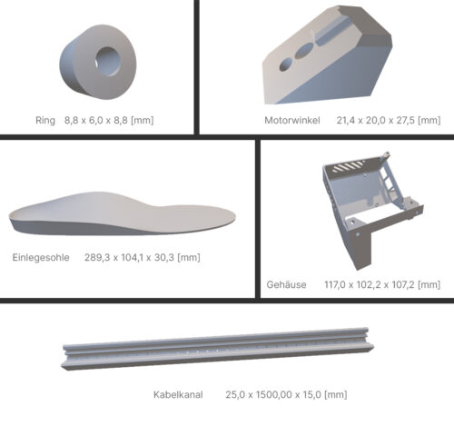 Für die Arbeit wurden fünf Objekte mit jeweils verschiedenen Parametern und Geometrien von zwei unterschiedlichen Druckern hergestellt.