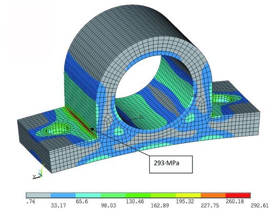 In der zweiten Analyse sind die Schrauben nicht vorgespannt. Doch welchen Einfluss hat die Schraubenvorspannkraft? Dazu wird im dritten Modell auch diese Lastkomponente berücksichtigt. Obwohl die Spannungen infolge der Vorspannung einen statischen Charakter haben, müssen sie bei der Bauteilauslegung mitberücksichtigt werden. Im Beispiel bedeutet dies eine Steigerung der Spannung um weitere 30 % gegenüber dem zweiten Modell (Bild 6).