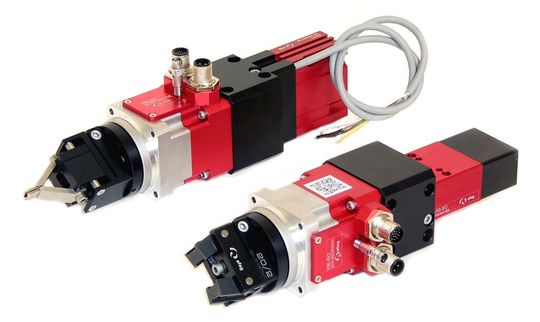Bei den neuen Greif-/Drehmodulen handelt es sich um die Kombination eines Rotationsmoduls mit einem Greifmodul in einer kompakten Einheit. Je nach Anforderung und Kundenwunsch besteht ein solches Greif-/Drehmodul dann jeweils aus einem Greifantrieb EG-20 oder GMQ 20 (elektrisch oder pneumatisch angetrieben), einem Rotationsmodul RE-50 (mit Normal- oder Kleinspannung) und einer Greifzange des Typs GMQ 20.