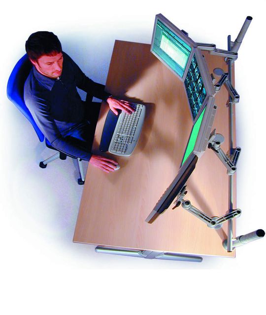 Der ergodynamische Bildschirmhalter von Leuwico eignet sich auch für Multimonitor-Arbeitsplätze, bei mehr als zwei Monitoren empfiehlt sich eine spezielle Monitorreling anzubringen.