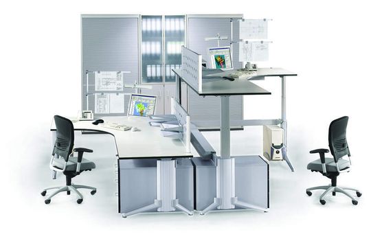 Leuwico hatte das frühzeitig erkannt und schon ab Mitte der Achtziger Jahre als erster Hersteller seine CAD-Arbeitsplätze mit einer soliden Höhenverstellungstechnik ausgestattet. Diese Technik hob damals die üblichen bleischweren Großmonitore mühelos auf Stehhöhe. Inzwischen bieten eine ganze Reihe von Büromöbelhersteller höhenverstellbare Bürotische an. Allerdings wünschen sich Konstrukteure heutzutage großformatige Freiform- und Ecktische. Dieser Wunsch stellt Anforderungen an die Verstelltechnik, die die meisten Fabrikate nicht bieten können: eine zuverlässige präzise Synchronisierung von drei Hubsäulen.