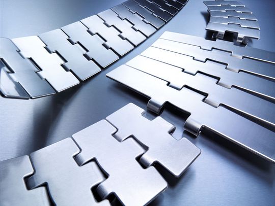 Scharnierbandketten bestehen aus Platten, die mit einfach und doppelt gestalteten Scharniergelenken miteinander verbunden sind. Durch diesen Aufbau ist es möglich, geradgängig und kurvengängig laufende Ketten mit einer Breite von bis zu 305 mm zu gestalten, auf denen Produkte direkt transportiert werden können. Mattenketten haben Mehrfachgelenke und zudem die Besonderheit, dass mehrere Kettenglieder nebeneinander angeordnet werden. So können beliebige Kettenbreiten und höhere Zugkräfte als bei Scharnierbandketten realisiert werden.