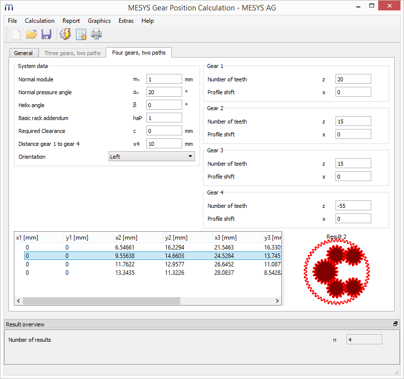 Die MESYS Berechnungssoftware zur Zahnradpositionierung ist ein einfaches Tool zur Berechnung der Positionen für Stirnradketten mit zwei Strängen zur Lastverteilung. Die Software erlaubt die Berechnung von symmetrischen Konfigurationen von Stirnradketten mit drei und vier Rädern. Ausgegeben werden die möglichen Lösungen inklusiver grafischer Darstellung. Eine Vorgabe des Mindestspiels zwischen zwei Zahnrädern wird dabei berücksichtigt.