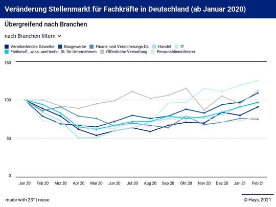 Im Hays-Fachkräfte-Index des Monats Februar 2021 zeichnet sich ein deutlicher Aufwärtstrend in der Nachfrage nach Fachkräften ab. Während im Januar noch 90 Indexpunkte zu verzeichnen waren, steigt der Wert für den Monat Februar auf 95 Indexpunkte.