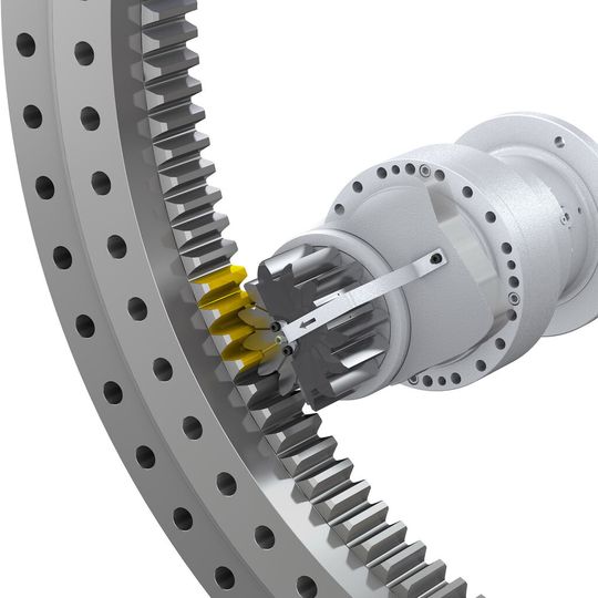 Liebherr liefert ein optimiertes System zur Schmiermittelversorgung von ineinandergreifenden Großwälzlager- und Getriebe-Verzahnungen. Diese neue Lösung vereinfacht die Nachschmierung und kann anstelle herkömmlicher Systeme eingesetzt werden. Dabei wird das Fett direkt über eine Schmierstoffzuleitung an der Stirnseite des Getrieberitzels zugeführt. Schmierstoffkanäle mit Austritt in jedem Zahnfuß ermöglichen die gezielte Fettversorgung im Zahneingriff. Der Schmierstoff kommt exakt dorthin wo er benötigt wird. Die Geometrie der jeweiligen Schmierstoffzufuhr ist so konzipiert, dass im vollen Zahneingriff maximal geschmiert wird oder die Fettzufuhr bei entsprechender Überdeckung auch über weitere Kanäle erfolgt. Durch verschiedene Lastversuche und Berechnungen wurde sichergestellt, dass die Bohrung im Zahnfuß keinerlei Auswirkungen auf die Verzahnungssicherheit hat.