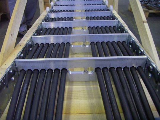 Die im 1-mm-Breitenraster lieferbaren Stahlketten mit Lochstegen und Zugentlastungselementen wurden in Abstimmung auf die zu verlegenden Leitungen mit einer Innenbreite von 529 mm gefertigt. Für eine optimale Leitungsführung wurde die Stegvariante LG aus Aluminium gewählt; für maximale Stabilität sind die Lochstege an den Kettenbändern verschraubt. Der besondere Vorteil dieser Ausführung ist, dass die Lochstege exakt auf die Belegung zugeschnitten sind, das heißt die Löcher werden passgenau zum Leitungsdurchmesser gefräst. Verrundete Kanten ermöglichen die schonende Führung der Leitungen, was durch verminderten Mantelabrieb die Lebensdauer erhöht.